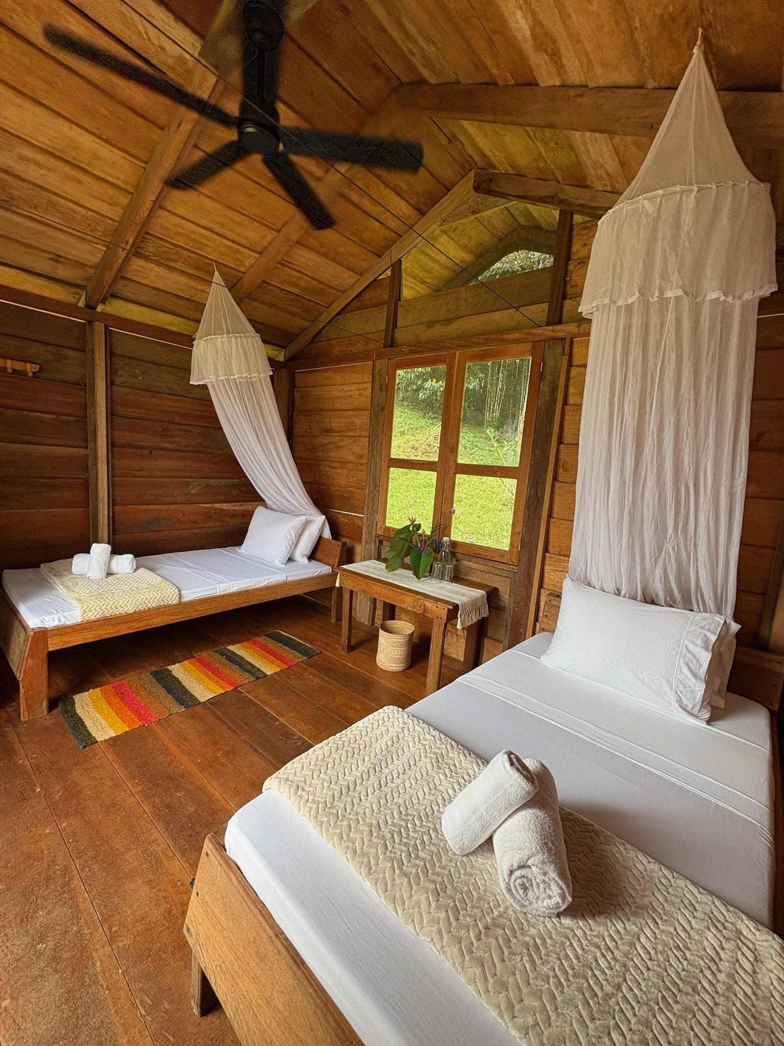 The eco-friendly cabins are handcrafted from natural wood and designed to blend seamlessly with the jungle. Elevated above the ground for safety and ventilation, they offer a cozy, grounding experience with views of the surrounding forest.