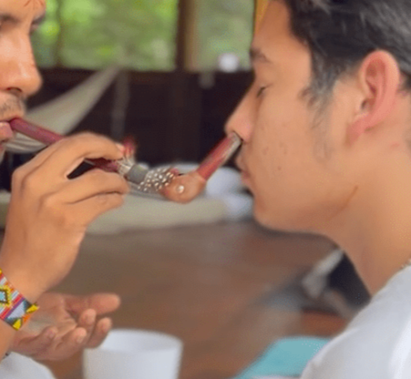 Experience the grounding ritual of Grandfather Tobacco (mapacho), Hapé Circle (tobacco ashes), Mambe (coca leafs), and Ambil (tobacco paste). This traditional practice, guided by the Taita, is used for clearing, reflection, and setting deep intentions.